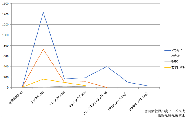 100gあたり ※アカモク、ワカメ 当社より日本機能分析研究所依頼 その他海藻 文部科学省食品成分データベース参照 H30.1/5現在 合同会社風の島フーズ作成(グラフの無断転用転載禁止します)